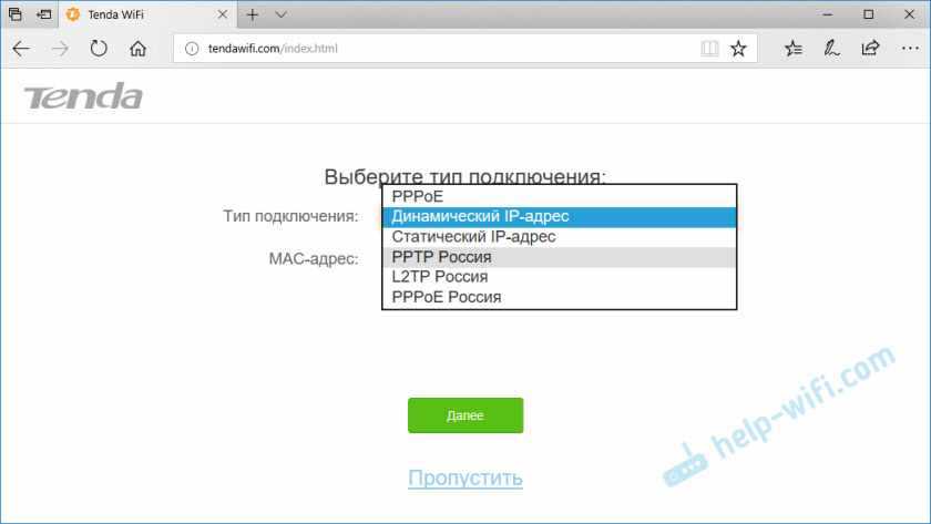 И если кабель в WAN порт подключен, то роутер предложит вам выбрать тип подключения к интернету. Это очень важные настройки, вы должны знать точно, какой тип подключения использует ваш провайдер. И делает ли он привязку по MAC-адресу. У меня ‘Динамический IP’, там настраивать ничего не нужно.