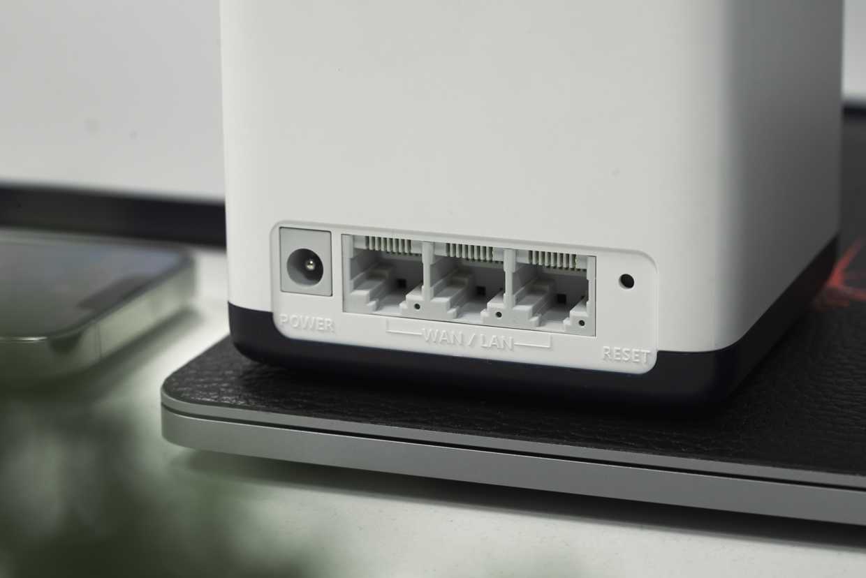 Выставляющихся антенн в корпусе устройства нет, это цельный куб с несколькими разъёмами. А именно: порт для зарядки от адаптера питания 12 В/1 А. Кроме того, имеются три порта LAN 1 Гбит/с, которые автоматически определяют WAN или LAN, а также кнопка сброса устройства.