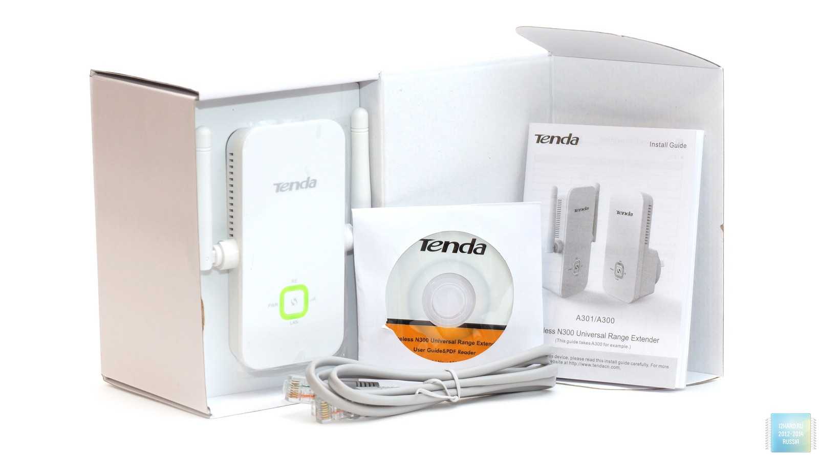 Коробка состоит из внешней обложки и внутренней коробки с комплектом. Кроме самого усилителя сигнала, имеется LAN кабель, диск с утилитой настройки и руководство пользователя. Инструкция подробная, с иллюстрациями, но на английском языке.
