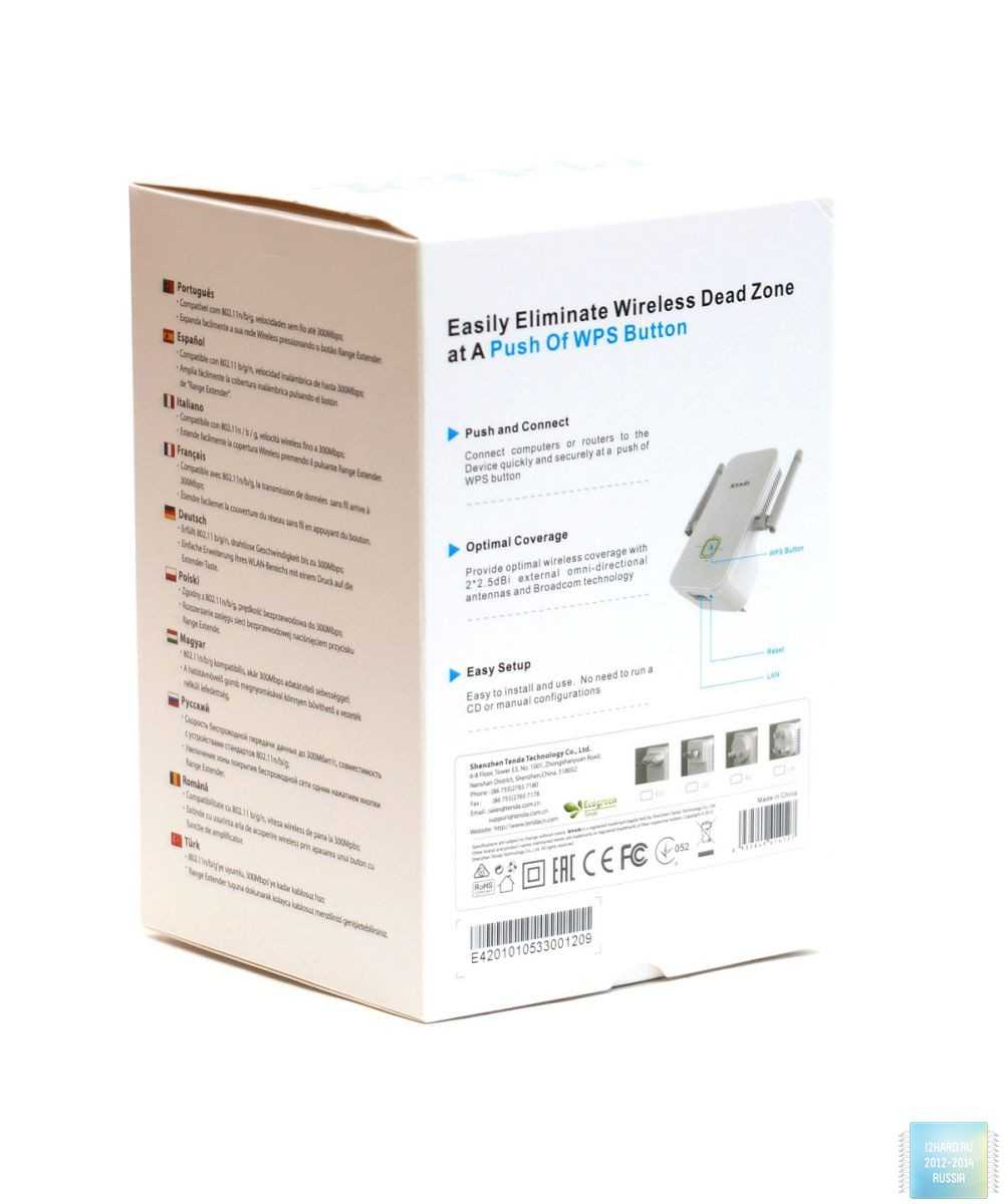 Усилитель сигнала поставляется в небольшой картонной коробке белого цвета. На лицевой стороне изображение самого устройства, несколько пиктограмм, указывающих на основные особенности. На обратной стороне краткое описание применения девайса. Сбоку, на нескольких языках, указана скорость передачи данных в 300 Мбит/с, поддержка стандартов 802.11 n/b/g и простота подключения нажатием одной кнопки.