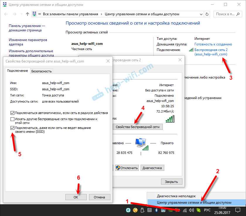 Откройте «Центр управления сетями и общим доступом» и нажмите на свою Wi-Fi сеть. В новом окне нажимаем на кнопку «Свойства беспроводной сети» и ставим галочку возле «Подключаться, даже если сеть не ведет вещание своего имени (SSID)». Нажимаем Ok.