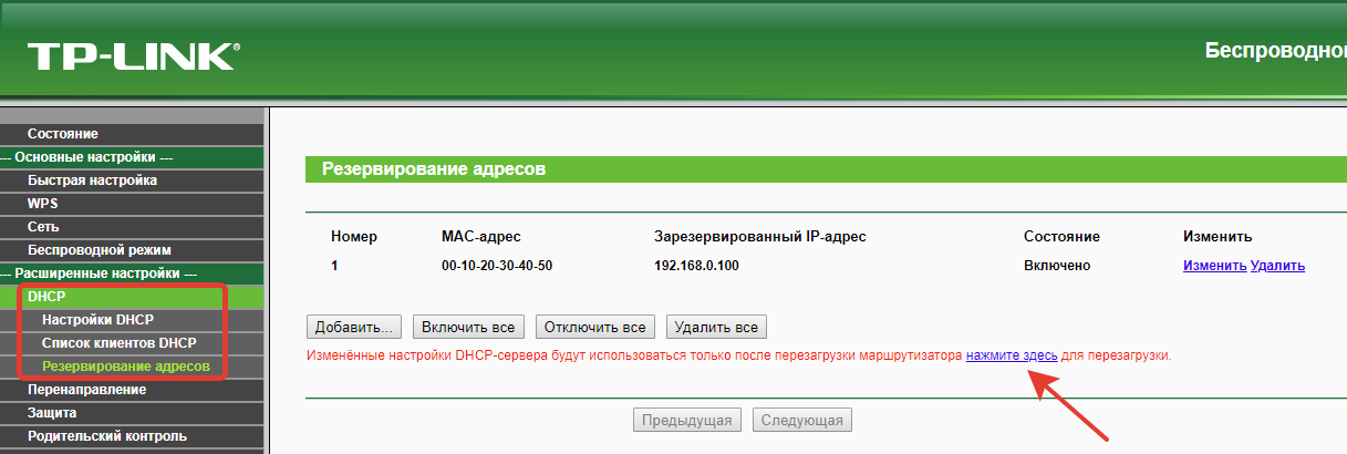 Если же IP-адрес получен динамически, то следует его закрепить за устройством по MAC адресу. Это делается в настройках DHCP сервера. На рисунке ниже показан пример резервирования адреса. После резервирования, следует перезагрузить маршрутизатор.