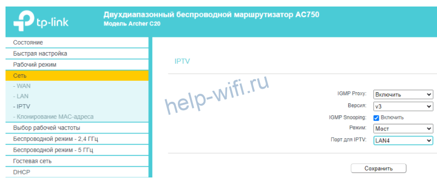 Для изменения настроек IPTV в меню откройте «Сеть» и перейдите в раздел IPTV. IGMP Proxy должен быть включен. Напротив пункта «Режим» выберите из выпадающего списка «Мост». А напротив «Порт для IPTV» укажите тот сетевой разъём, который будет использоваться для подключения ТВ-приставки.