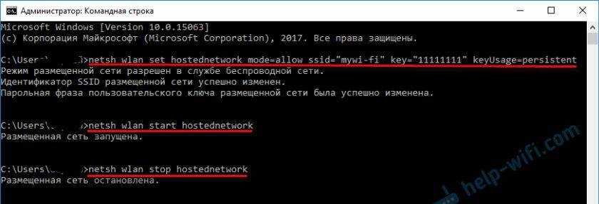 netsh wlan set hostednetwork mode=allow ssid=”mywi-fi” key=”11111111″ keyUsage=persistent – где “mywi-fi” это имя сети, а “11111111” это пароль. Их можно сменить на свои. Эту команду выполняем только один раз. Или когда нужно сменить имя сети, или пароль.