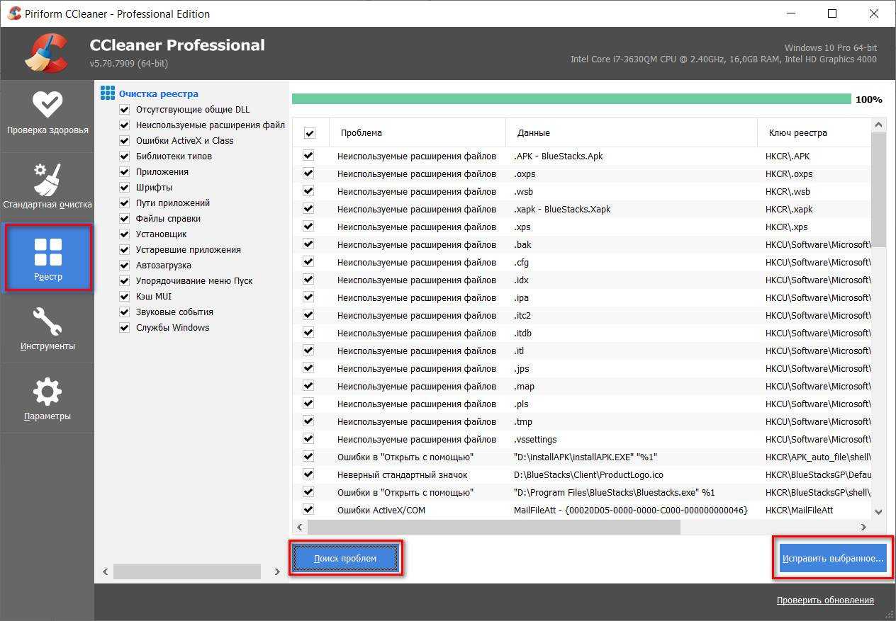 Далее заходим в раздел «Реестр» и ищем проблемы. После поиска жмем «исправить».