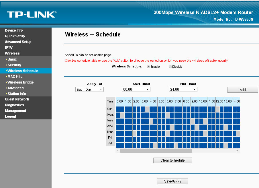 В качестве дополнительной настройки «TD-W8960N» стоит обратить внимание на раздел «Wireless Schedule» — это возможность установки расписания на включение/отключения вещания беспроводной сети. Настройки выглядят следующим образом: