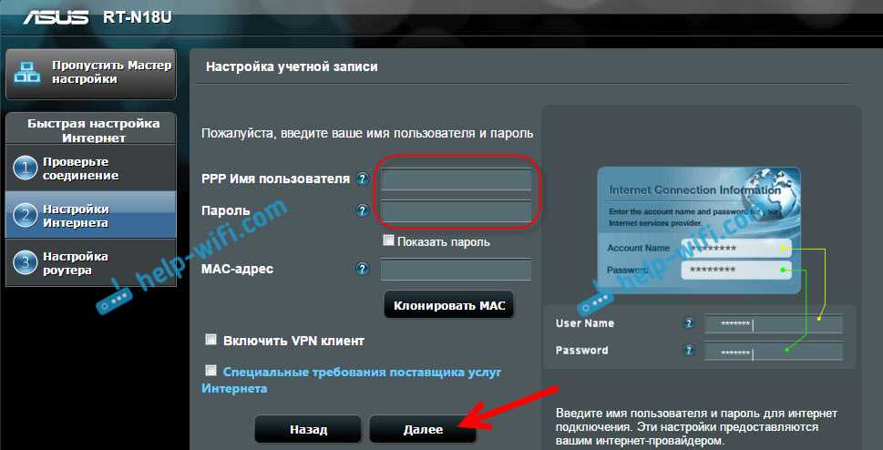 Если вы выбрали Да, то нужно будет указать имя пользователя и пароль. Это обязательные настройки, их выдает провайдер. Возможно, если ваш провайдер делает привязку по MAC адресу, то нужно будет клонировать MAC-адрес (при этом, вы должны настраивать роутер с того компьютера, к которому был подключен интернет). Или же, задать еще какие-то параметры. Все зависит от вашего интернет-провайдера. Можно смело звонить в поддержку, и обо всем расспрашивать.