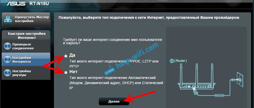 Если же у вас Динамический IP, Статический IP, или подключение через модем, то выберите Нет, и нажмите Далее.