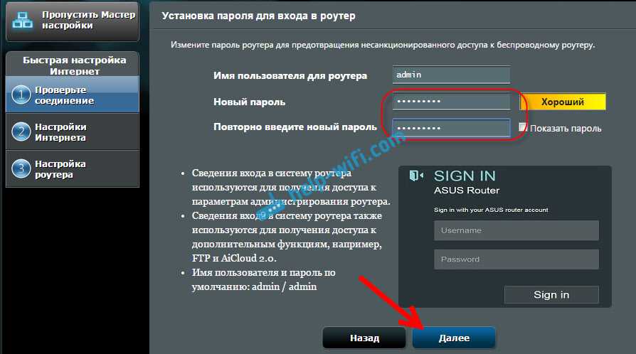 Роутер сразу попросит нас установить пароль для защиты настроек. Стандартный admin, и нам его нужно сменить. Придумайте хороший пароль, и укажите его два раза. Этот пароль нужно будет указывать при входе в настройки роутера Asus RT-N18U. Нажмите кнопку Далее.