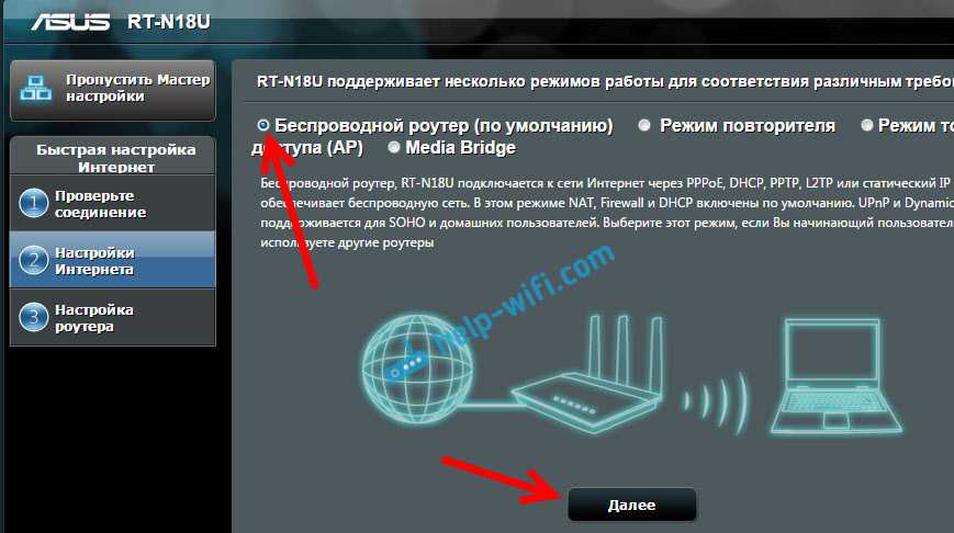 В окне выбора режима работы роутера оставляем Беспроводной роутер, и нажимаем Далее. Кстати, у нас есть инструкция по настройке роутера Asus в режиме репитера.