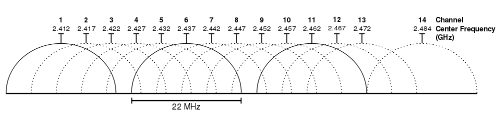 Каналы 1-14 — это 14 каналов для стандарта 802.11b/g/n. Полосы радиочастот 2400-2483,5 МГц, мощность излучения передатчика не более 100 мВт. Малый радиус действия.