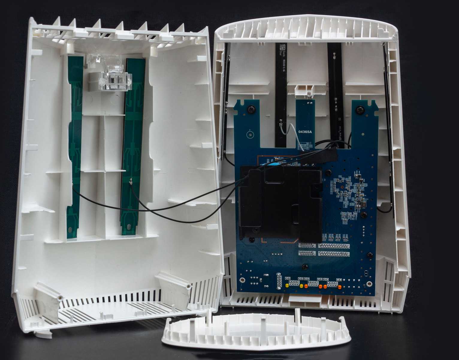 Внутри мы видим текстолитовую плату, прикрученную к корпусу. По стенкам корпуса шесть вертикальных плоских антенн: четыре на задней и две на передней половинке корпуса.