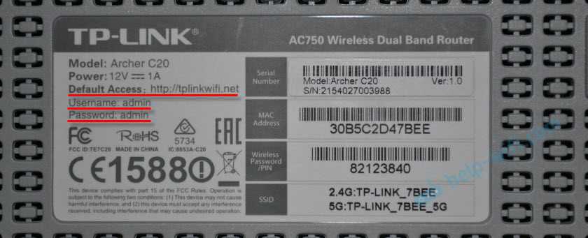 Нужно узнать адрес личного кабинета роутера TP-Link. На всех новых моделях используется адрес http://tplinkwifi.net. Плюс так же работает IP-адрес http://192.168.0.1. Раньше использовался только IP-адрес http://192.168.1.1. Заводской адрес странички с настройками вы можете посмотреть на наклейке, которая есть на днище маршрутизатора.Кроме адресf (Default Access) там так же указан заводской логин и пароль (admin и admin), заводское имя Wi-Fi сети (SSID) и пароль к ней (Wireless Password).