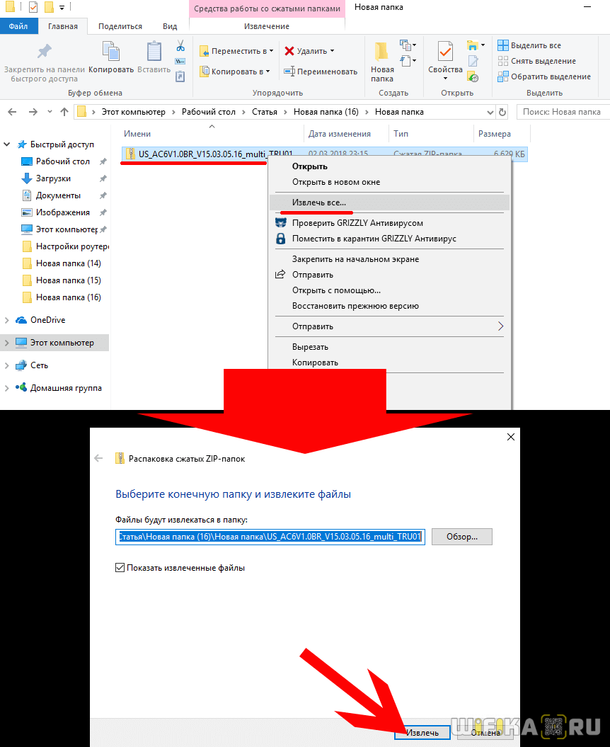 Но в таком виде залить на роутер мы ее не сможем, потому что загруженный файл — это архив. Чтобы его распковать кликаем по названию правой кнопкой мыши и выбираем «Извлечь все…», после чего в следующем окне еще раз нажимаем на «Извлечь»