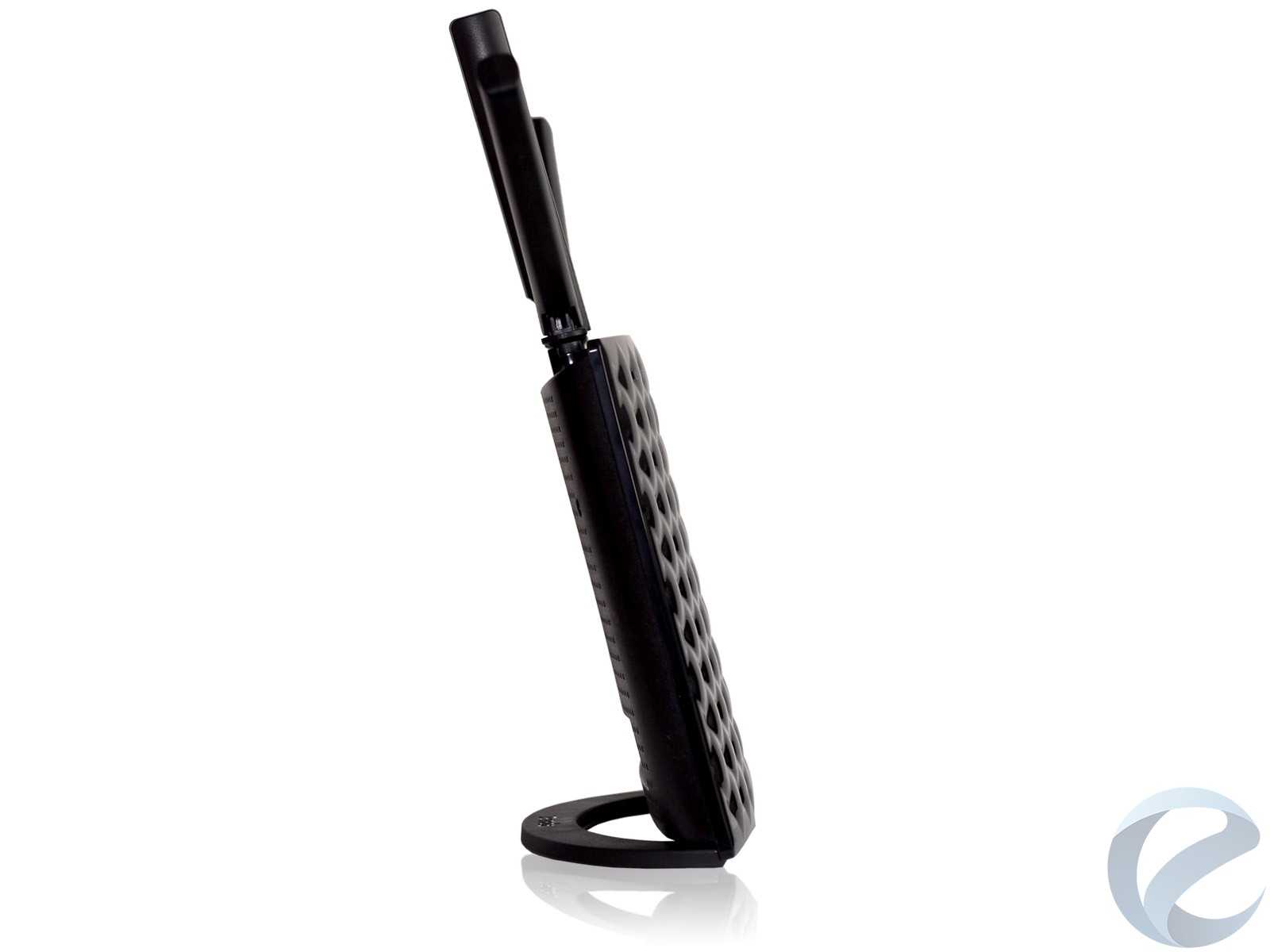 Комплектная подставка с надписью Tenda надежно фиксируется на противоположном торце устройства с помощью пластиковых защелок. На ее основании приклеены три крупные прорезиненные ножки, придающие сопротивление случайному сдвигу по столешницам.