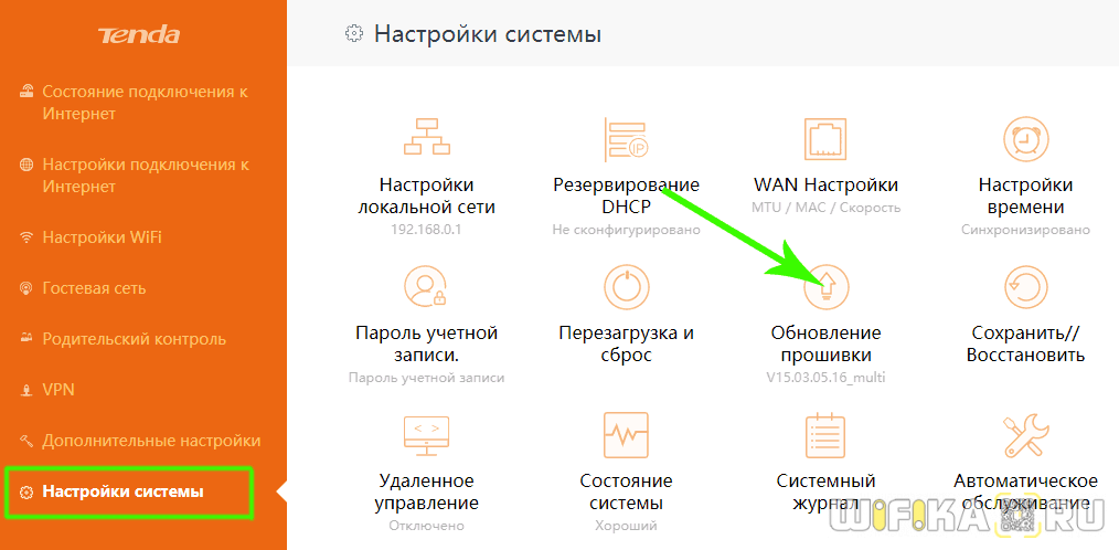 Здесь находим пункт «Обновление прошивки» в разделе «Настройки системы». Под заголовком указана текущая версия программного обеспечения роутера.