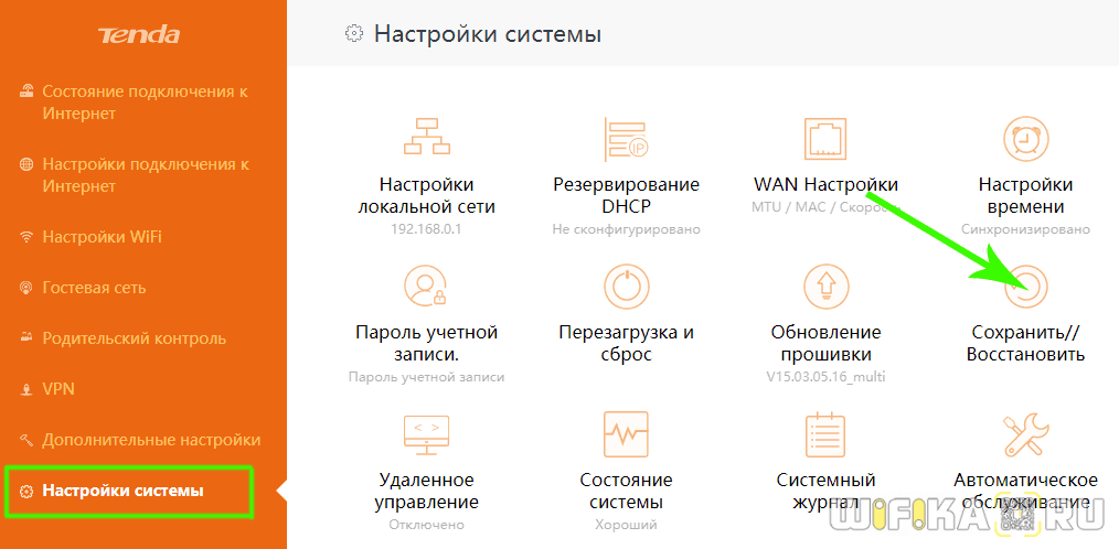 Теперь все-таки на всякий случай сделаем резервную копию настроек роутера Tenda — вдруг мы не сможем найти информацию для подключения, которую предоставил провайдер, и создадим себе в дальнейшем лишние хлопоты?