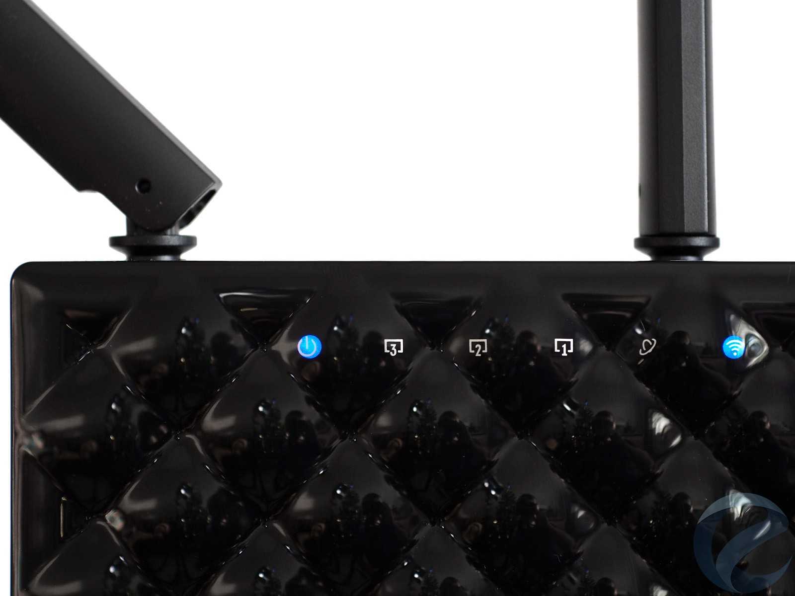 На плоском квадратном корпусе зафиксированы четыре внешние антенны с поворотным механизмом. Спереди, с тыловой стороны расположены индикаторы состояния роутера — питание, работа на частотах 2,5 и 5 ГГц, уровень сигнала, WPS и подключение через разъемы к другим гаджетам. Все кнопки для управления перенесены на обратную сторону. И здесь же расположились разъемы для подключений — один WAN и три LAN, а также разъем для питания.