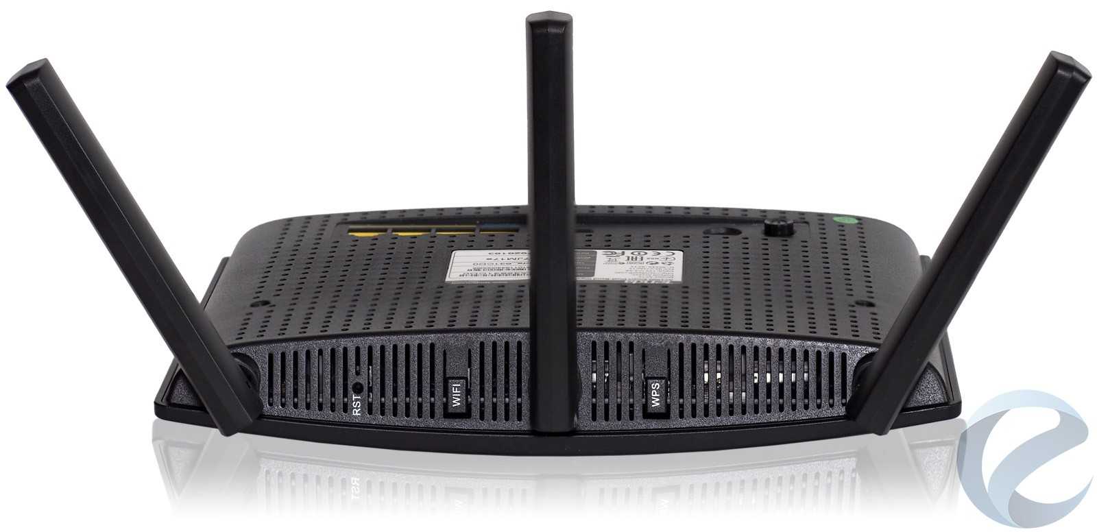 На заднем торце, который оказывается сверху при установке на подставку, установлены три поворотные несъемные антенны, между которыми разместили (слева-направо): утопленную под корпус кнопку сброса настроек, кнопку ручного включения и выключения Wi-Fi и кнопку WPS для быстрого подключения новых устройств к беспроводной сети.