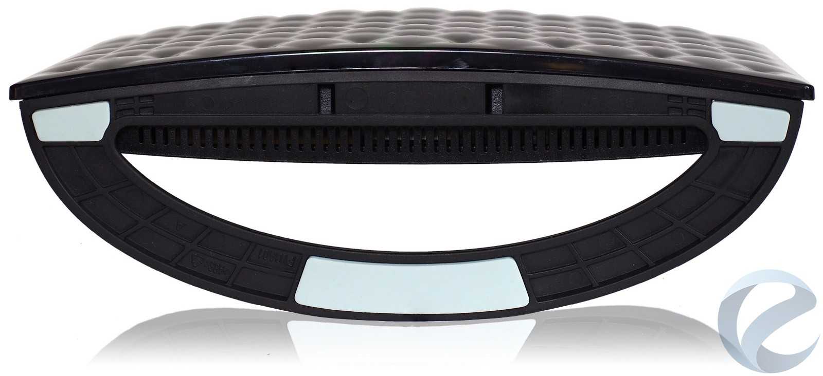 С обратной стороны корпус маршрутизатора обильно перфорирован для пассивного отвода тепла от внутренних электронных компонентов. Посередине имеется наклейка с информацией о модели,MAC-адресе Wi-Fi интерфейса, серийном номере устройства, SSID беспроводной сети, пароле к ней и пин-коде для подключения через WPS.