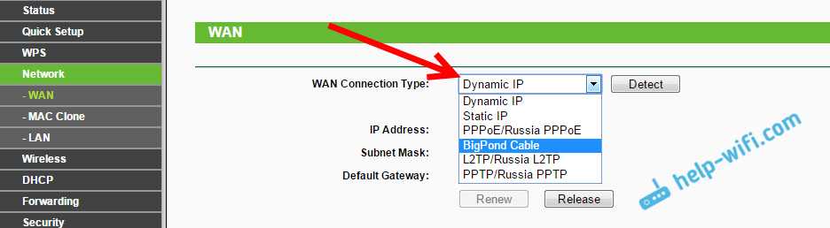 В настройках откройте вкладку Network — WAN. Это самые важные настройки. В поле WAN Connection Type вы должны выбрать тип подключения, который использует ваш интернет-провайдер: Динамический IP, Статический IP, PPPoE, L2TP, PPTP. Уточните его у провайдера, или смотрите в договоре, который вам выдали при подключении к интернету.